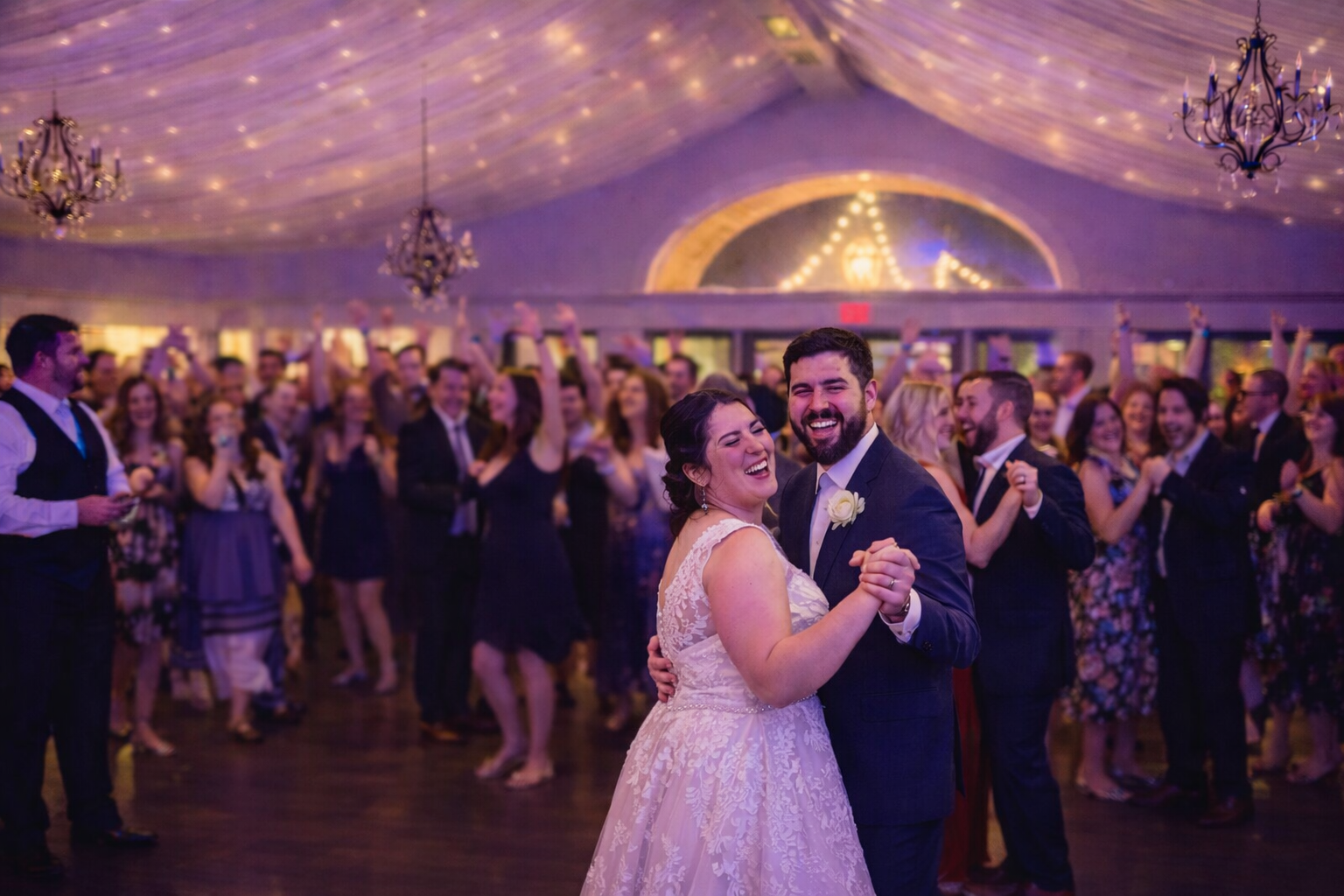 Crowded wedding dance floor with guests dancing during a Durham wedding reception.